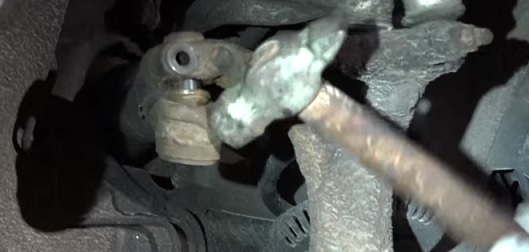Или ослабляем контргайку совсем немного, чтобы затем можно было вернуть её в то положение, в котором она находилась. Выбиваем рулевой наконечник из посадочного места на поворотном кулаке (рычаге) с помощью молотка: