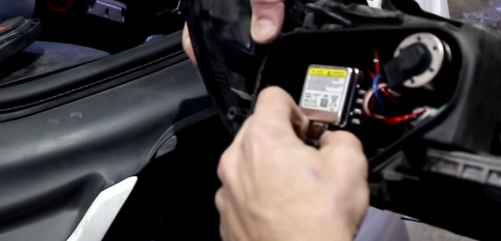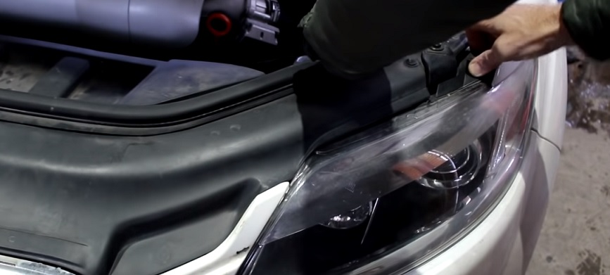 До конца его вытаскивать не следует. Фару теперь можно выталкивать вперёд, при этом одной рукой необходимо нажимать на пластиковый флажок: