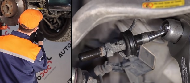 Рулевой наконечник выводим из посадочного места при помощи съёмника, при его отсутствии можно выбить молотком. Откручиваем рулевой наконечник руками, контргайку при этом лучше всего держать ключом: