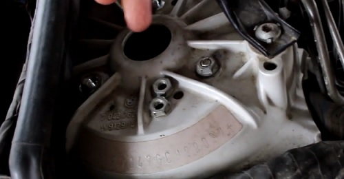 Поднимаем автомобиль, снимаем колёса. Из под капота откручиваем две гайки на 13, вытаскиваем резиновую заглушку и ослабляем центральную гайку на стойки, она под головку на 21:
