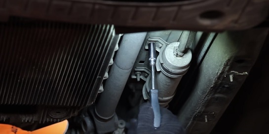Поднимаем машину. Головкой на 10 откручиваем два крепления корпуса фильтра: