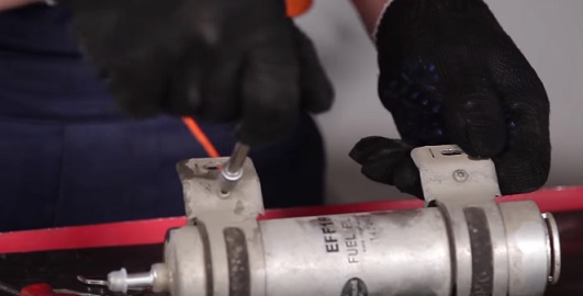 Плоской отвёрткой откручиваем хомут на топливном шланге:
