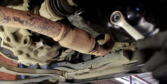 Поднимаем машину, чтобы вам было лучше видно, с правой стороны сняли пыльник. Откручиваем масляной фильтр, часто это можно сделать при помощи силы рук, у нас не получилось, поэтому используем для этого универсальный съёмник-краб: