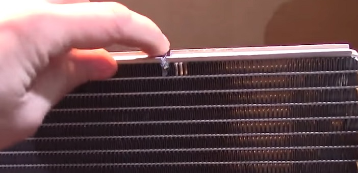2 года назад на этой машине, в сильный мороз за -30 градусов потёк радиатор. Протечку удалось заделать при помощи специального герметика, таким образом удалось проездить пару лет. Чтобы в дальнейшем проблем не возникало, было решено приобрести новый радиатор, у нас он фирмы Nissens, номер для заказа 62028A. Стоимость на момент покупки 3 тысячи рублей, оригинальный при этом стоит около 7. На корпусе радиатора присутствуют «пропилы», вот так они выглядят: