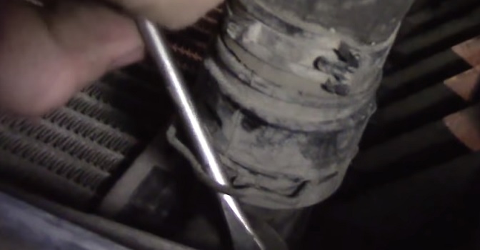 Отсоединяем нижний и верхний патрубки, нижний крепится металлическим хомутом, верхний скобой. Чтобы подобраться к верхнему мы демонтируем гофру воздушного фильтра. Затем плоской отвёрткой подцепляем скобу на патрубке и выдёргиваем её вверх: