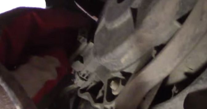 Если вы увидите их, не пугайтесь, они выступают в качестве теплового зазора, чтобы при сильном нагреве, радиатор мог немного «играть». Для работы нам понадобится смотровая яма или подъёмник. Первым делом мы снимаем защиту картера. Из под низа видим защёлку (собачку), при помощи которой крепится вентилятор, отщёлкиваем её: