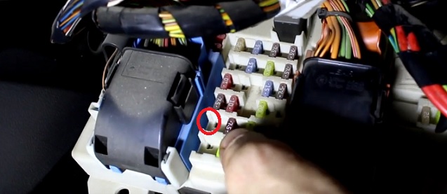После этого блок предохранителей можно опускать вниз. Вытаскиваем старый предохранитель на 20 Ампер из место отмеченного красным кружком: