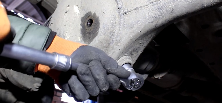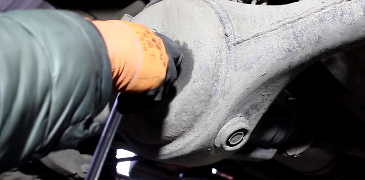 Поднимаем машину, подставляем под задний редуктор подходящую ёмкость для отработанного масла. Головкой на 24 откручиваем сначала заливную пробку: