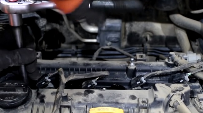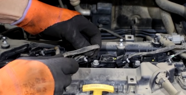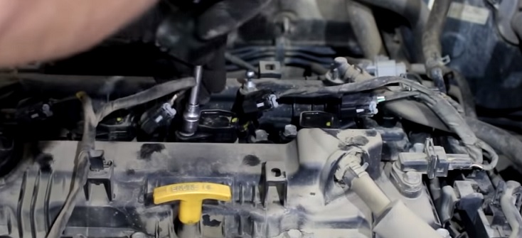 Теперь катушки можно поднимать и убирать в сторону. Внимательно посмотрите их, нет ли подтёков масла. Если вы обнаружили масло, то это может свидетельствовать о том что разъело уплотнительный колпачок на катушке или на подсвечнике, протекает клапанная крышка и т.д. Перед тем как откручивать свечи, не лишним будет ещё раз продуть свечные колодца сжатым воздухом. Свечным ключом на 16 или соответствующей головкой с прорезиненным основанием откручиваем свечи: