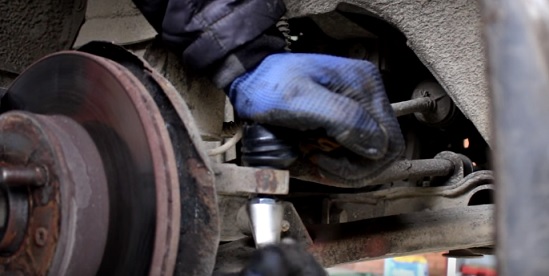 Далее, если у вас есть специальный съёмник для рулевых наконечников, можете его использовать, если нет, то как в нашем случае при помощи молотка наносим пару хлёстких ударов в цапфу.