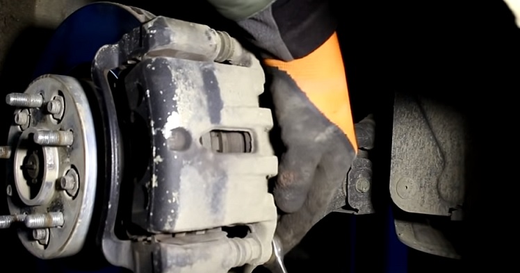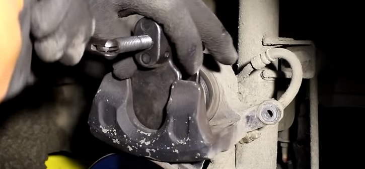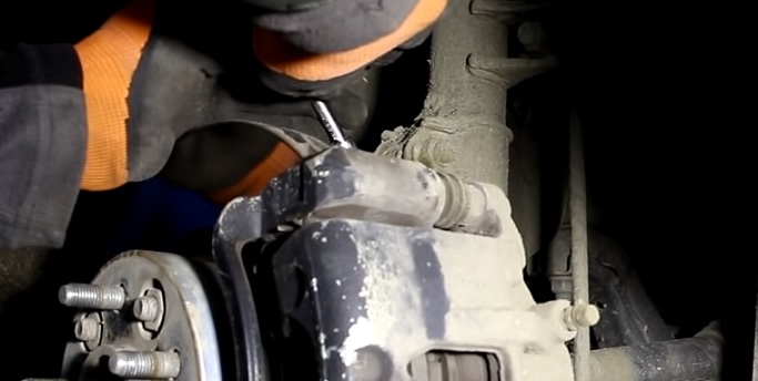 Ключом или головкой на 14 выкручиваем два болта крепления суппорта: