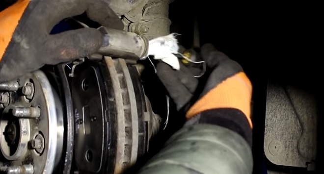 Снимаем суппорт и кладём его наверх, чтобы он не висел под нагрузкой на тормозном шланге. Вытаскиваем старые тормозные колодки. При помощи плоской отвёртки сверху и снизу снимаем металлические скобы: