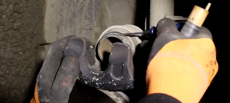 Новую смазку для направляющих и суппортов, мы используем фирмы FEBI, номер для заказа 31942. Также мы наносим смазку под пыльник суппорта, для этого поддеваем его тонкой отвёрткой и выдавливаем небольшое количество смазки из шприца: