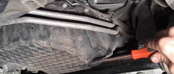 Следующим этапом открываем крышку маслозаливной горловины. Снимаем защиту картера и откручиваем сливную пробку, она пластиковая открутить её можно обычной шлицевой отвёрткой: