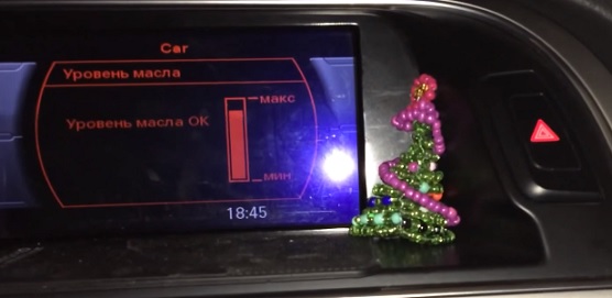 Мы используем масло вязкостью 5w30, вы смело можете заливать сразу 4.5 литра. Затем заводим двигатель и прогреваем его до рабочей температуры. Так как визуального щупа здесь нет, мы будем использовать показания датчика уровня масла, который стоит на данном автомобиле. Заходим в меню, затем на вкладку уровень: