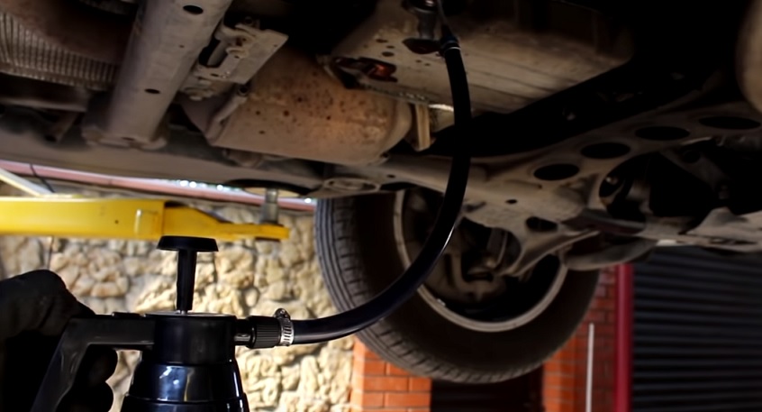 Заливаем новое масло в наш самодельный нагнетатель, заливаем его в систему через пробку уровня, до того момента как оно потечёт обратно. Затем заводим автомобиль и снова производим закачивание.