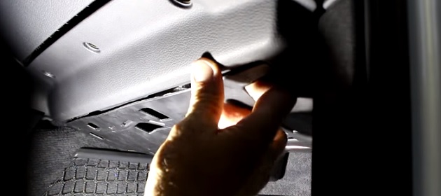 Открываем переднею пассажирскую дверь, внизу в ногах под бардачком снимаем пластиковый пыльник: